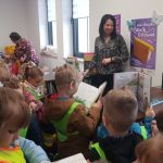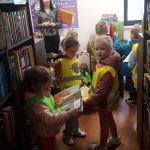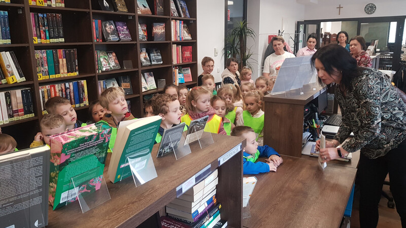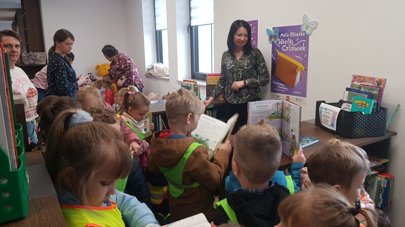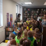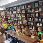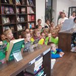 Następnie przeszliśmy między regałami, by dotrzeć do działu literatury dziecięcej. Tam najmłodsi mogli samodzielnie wybrać i przejrzeć interesujące ich książki. Kolejnym punktem programu była czytelnia, w której dzieci krótko zapoznano ze zgromadzonymi zbiorami. Przy kolekcji regionalnej pani dyrektor opowiedziała o znaczeniu „małej ojczyzny”.